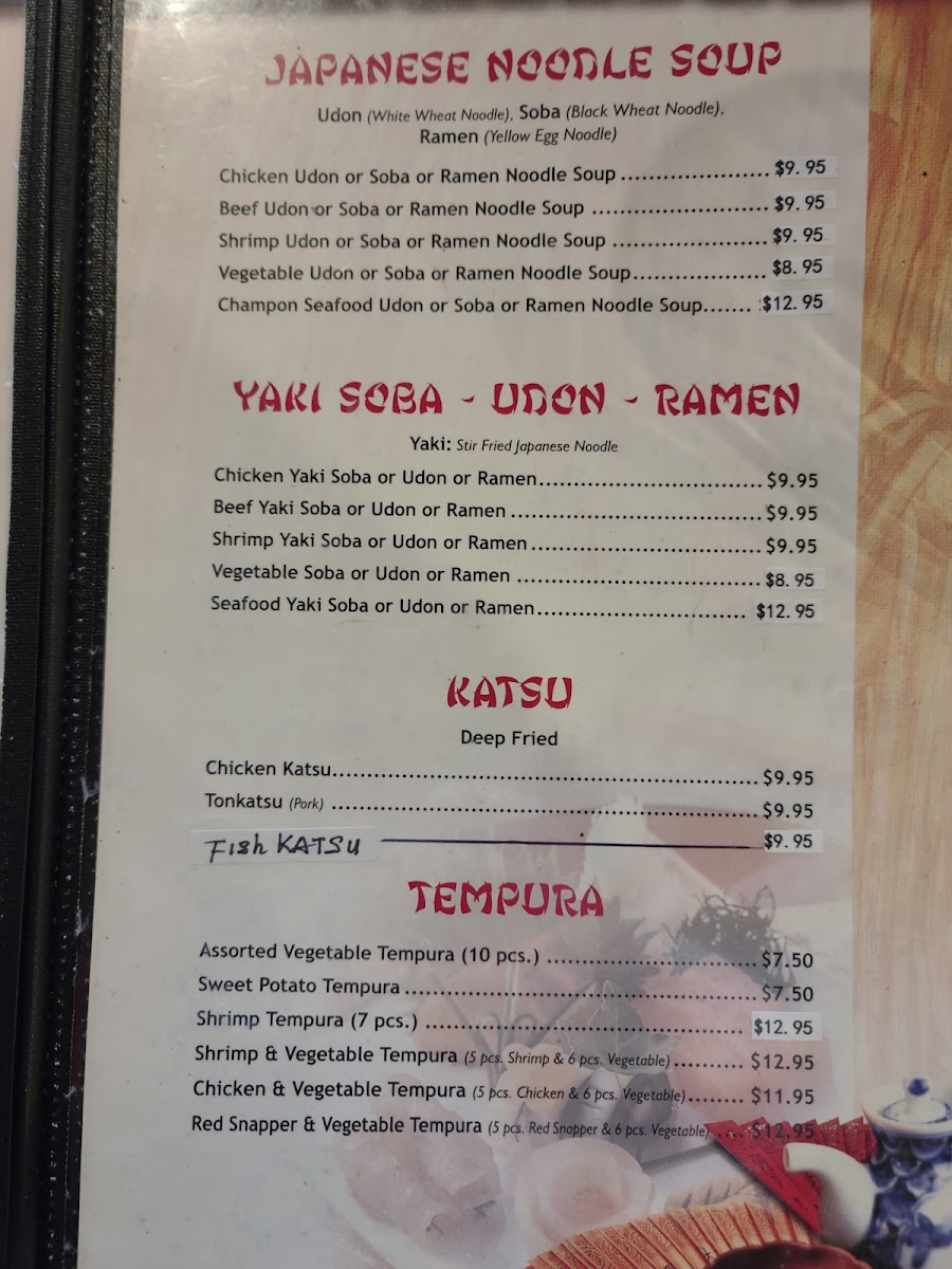 Soups and Noodles: The menu offers traditional Japanese soups such as onion soup and noodle dishes including beef udon, soba, and ramen, offering warm and fulfilling options.