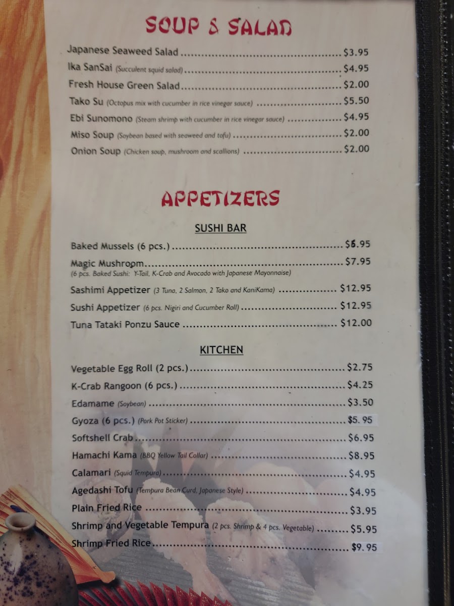 The menu at Tokyo Japanese Steakhouse & Sushi Bar features a diverse selection of Japanese cuisine, including both traditional and contemporary dishes suitable for casual dining. The menu is structured into distinct categories to accommodate various preferences and dining occasions, from light bites to more substantial meals.
